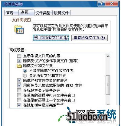 2、点击应用和确定后,在文件夹窗口的工具——文件夹选项——查看里面选择不显示隐藏的文件和文件夹。