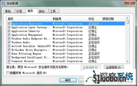 3、会弹出"系统配置"的对话框,然后选择"服务"这个选项卡.你可以看到很多运行的服务.将前面的复选框的勾选上.然后点击"全部禁用"按钮.确定即可.(禁止服务时候.先确定 不是系统必须的服务(即禁用也不会影响系统的运行)。