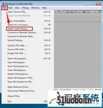4、在windbg中点击【File】-----【openCrashdump】选择.dMp文件打开。