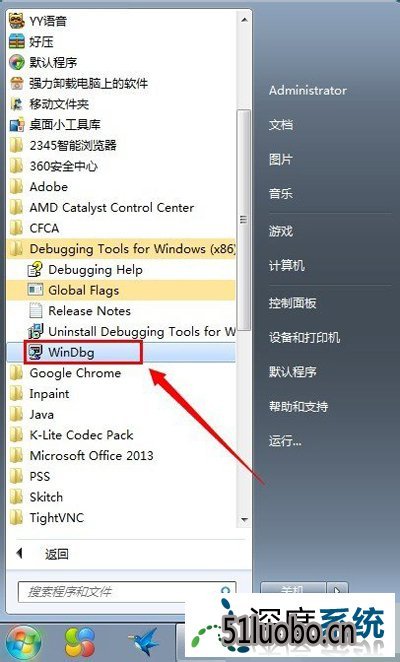 2、安装好了以后,在开始菜单下面的可以找得到一个【debuggingToolsforwindows(x86)】文件夹下面就会出现如下图所示:windbg点击进入。