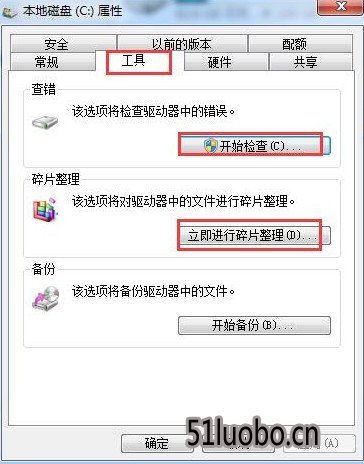 5、打开磁盘属性,点击“工具-开始检查”检查磁盘中的错误,再点击“立即进行碎片整理”,进行修复错误。