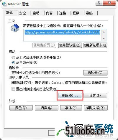3、在internet属性的对话框中,点击浏览历史记录下方的删除键;