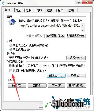 5、如果觉得每次这样操作很麻烦,也可以将“退出时删除浏览历史记录”前的方框勾选上,这样当退出浏览器时,系统就会自动清除浏览记录;