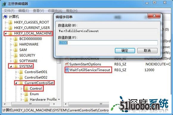 同样点击任务栏的【开始-运行】,然后在运行输入框上输入“regedit”,按回车键即可进入到注册表编辑器,在窗口上依次打开到:HKEY_LoCAL_MACHinE\sYsTEM\CurrentControlset\Control。 然后在右侧的窗口上找到“waitToKillserviceTimeout”项目,双击打开该项目,其默认值为“12000”,这表示关机等待的时间设置为“12秒”用户可以根据自己电脑配置和需要输入理想的数字即可加快的你关机速度了。
