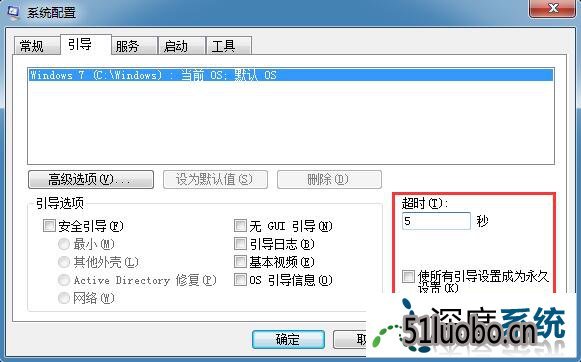 点击任务栏上面的【开始-运行】,然后在运行上面输入“msconfig”,然后敲回车确定,萝卜家园,即可打开系统配置窗口,切换到“引导”标签。在引导栏的右下角上的“超时”默认是30秒将更改为5秒,这样就在开机的时候缩短了开机的等待时间了。如图所示: