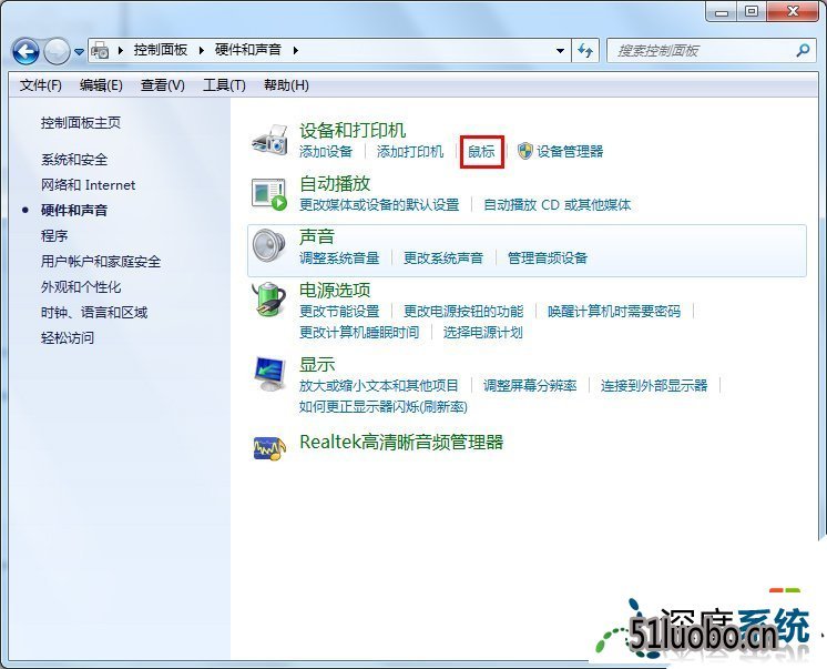 4、点击“设备和打印机”栏目中的“鼠标”;